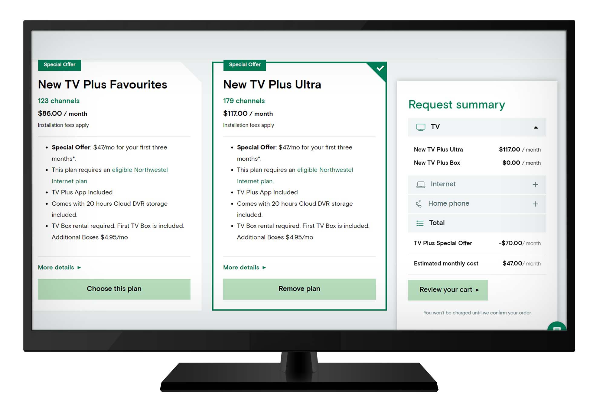 Once your package is selected, you can scroll down to see Select Add-ons. Add-ons will not be visible for selection until a TV Plus package is selected.